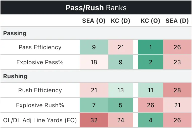 - For the season. they rank 28th in EPA and 29th against the run. I find it difficult to believe the Chiefs won’t score on most every drive. Seattle is 31st in punts per drive and KC has not faced any team in the bottom five all season.