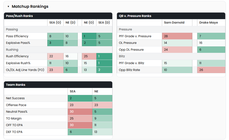 Special Teams: Based on how good both teams have been in the return game, it’s important to point out that both are relatively good Special Teams units. These teams rank 1-2 in punt return DVOA while Seattle ranks 1st in covering kicks and 6th best in kick returns. The Seahawks have dervied such great field position from kick returns and Shaheed punt TDs, that this could end up being the difference in the outcome of the game. Marcus Jones may be the best punt returner in the league and this will be the first time all year that Seattle will be facing a better return unit.
