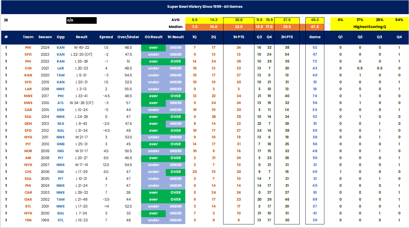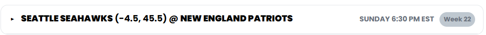 Final Prediction: I know the buzz isn’t really there for this matchup and some think Seattle should roll but I absolutely do not see that in this game. Seattle has not faced the Coach-QB-Defense trio like they will see with the Pats on Sunday. While Maye has not played up to his MVP level in the Playoffs he has faced three major step ups in defenses and all were played in tough weather conditions. He did make enough plays, if not his arm but with his legs, to get the job done and covered two games easily. I do think it’s a lower scoring game as neither team will be able to run the ball at all, NE does not have the speed and playmaking on the outside to consistently threaten this elite SEA secondary and the Pats are one of the best defenses Darnold has faced all season (and has struggled vs other elite defenses). NE has the clear edge in experience from a coaching perspective and we know that Vrabel is probably the best HC in modern NFL as an underdog. As an underdog, Vrabel teams are 58% ATS and have won SU 14% more games than expected. 62% ATS and have won 24.5% more games than expected as underdogs >3 points. With Gonzalez spending a lot of time on JSN and the Pats elite run defense slowing down Walker on early downs, can Darnold really step up to the point that he can solely make plays enough to cover such a large number? I am skeptical but do think it will be a close, lower scoring game. I will go with a tight NE win 21-20.
