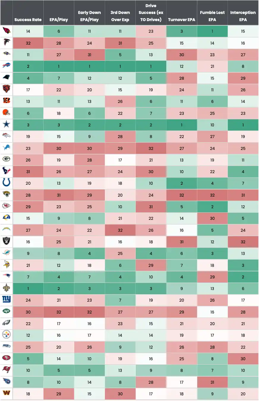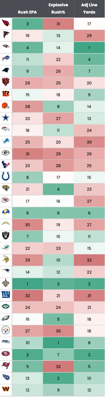 - For the season. they rank 28th in EPA and 29th against the run. I find it difficult to believe the Chiefs won’t score on most every drive. Seattle is 31st in punts per drive and KC has not faced any team in the bottom five all season.